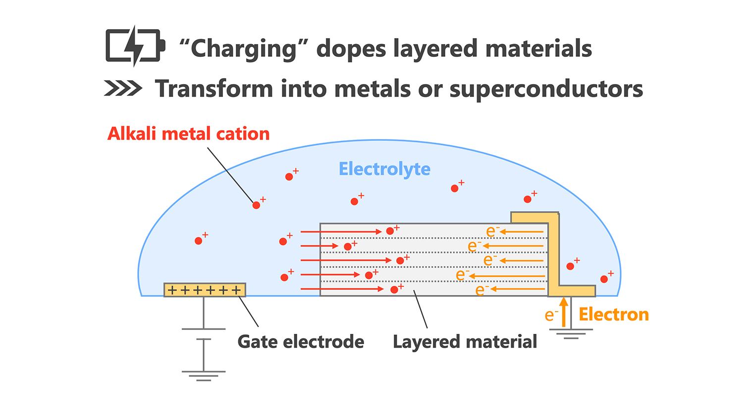 Rather than focusing on the operation of the battery itself, attention to the charged layered material reveals that it resides in a state with a higher electron density than in the pristine material. This situation is essentially equivalent to electron doping in semiconductor engineering. When semiconducting materials are employed as the layered material, controlling the degree of charging enables a transition from a semiconducting state to a metallic state and, in some cases, even to a superconducting state.