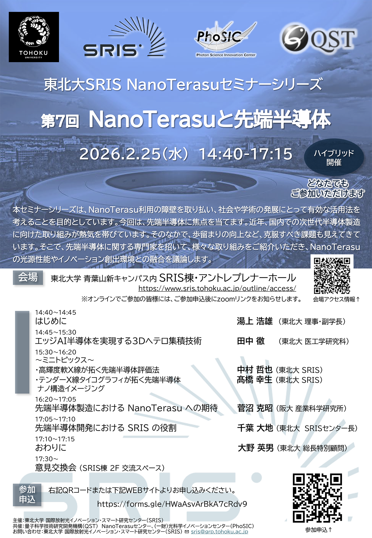 2026.2.25(水)『東北大SRIS NanoTerasuセミナーシリーズ 第7回 NanoTerasuと先端半導体』が開催されますのでご案内申し上げます。