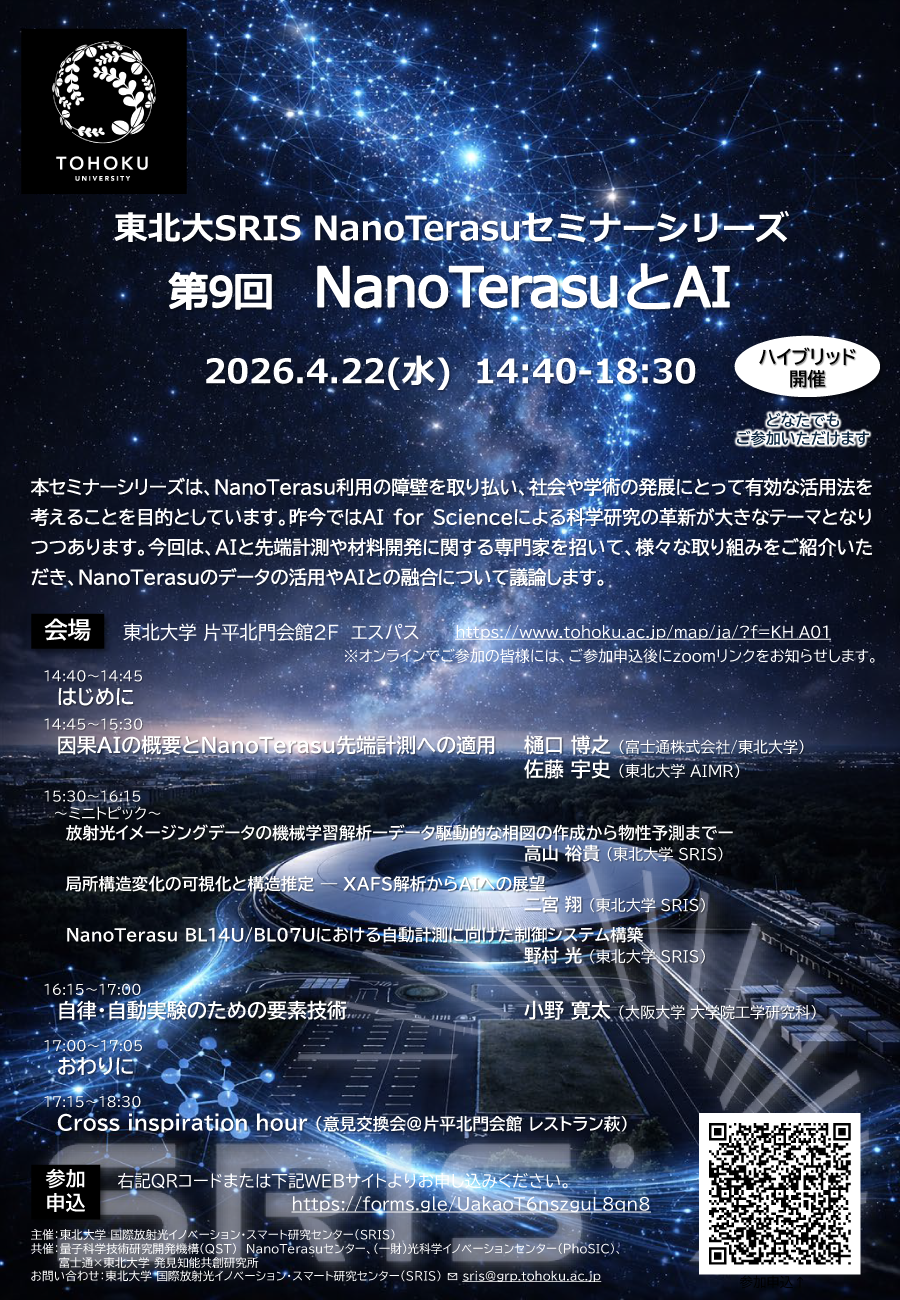 2026.4.22(水)『東北大SRIS NanoTerasuセミナーシリーズ 第9回 NanoTerasuとAI』が開催されますのでご案内申し上げます。